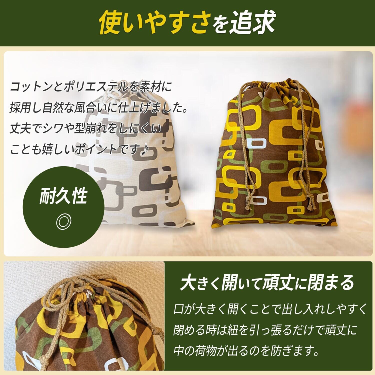 当商品はコットン、ポリエステル製の大型巾着袋です。 民族調を意識した模様で、コットンの自然な風合いを活かしたオシャレな収納バッグとして、日常や旅行の際に活躍します。